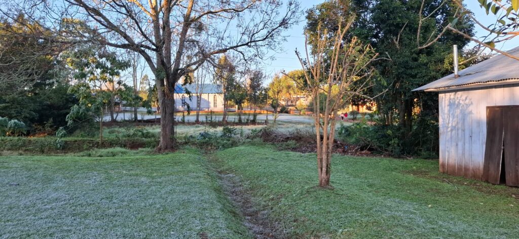 Por otra parte, en El Soberbio también amaneció con heladas en distintos sectores de la ciudad. Las imágenes corresponden a la Escuela N° 560 Colonia Alborada está a cuatro kilómetros de la ruta 2 entre Santa Rita y El Soberbio.