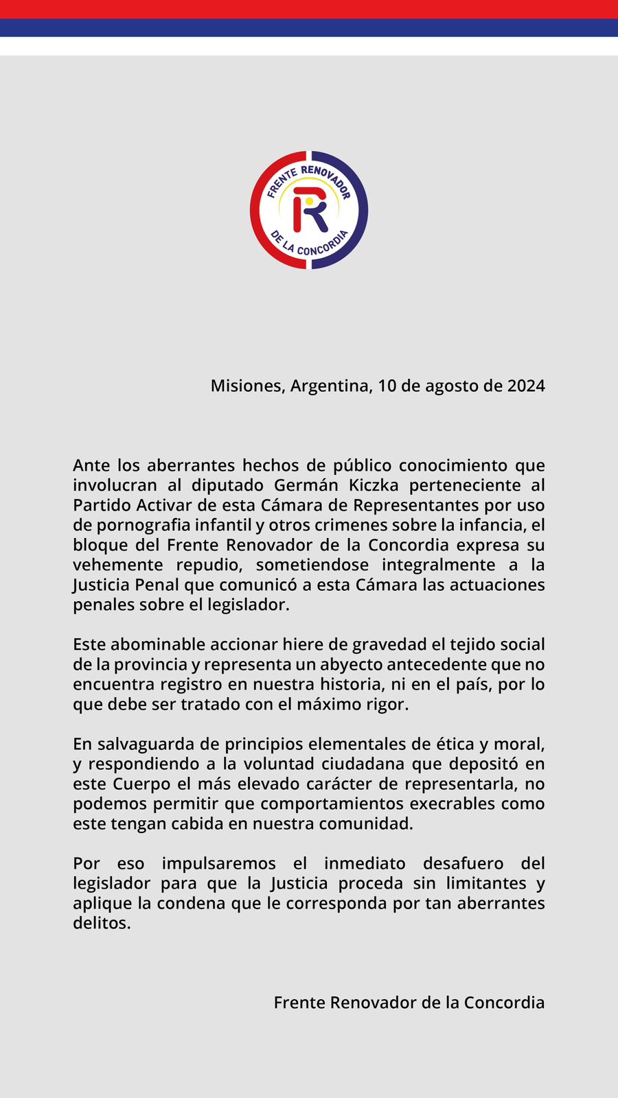 La reacción del Frente Renovador fue más allá del simple repudio, ya que el bloque ha anunciado que impulsará el desafuero inmediato de Germán Kiczka. Esta medida busca remover cualquier obstáculo que impida a la Justicia actuar de manera implacable contra el legislador puertista, permitiendo que enfrente las consecuencias de sus supuestos crímenes sin ningún tipo de protección.