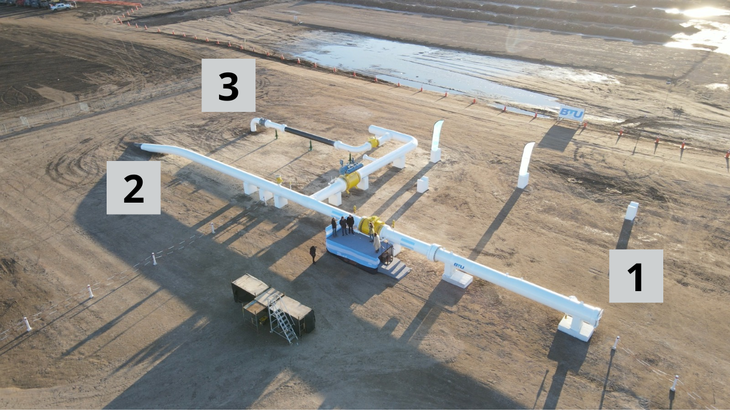 En tanto, a la izquierda del escenario se pueden ver otros 2 tubos metálicos: uno de ellos (2, en la imagen) emerge desde la tierra, y es el que proviene desde la localidad de Tratayén, Neuquén, y el otro (3) se dirige hacia la planta compresora Saturno, que está ubicada a unos kilómetros de allí y se conecta con el gasoducto Neuba II, que transporta el gas hacia el Gran Buenos Aires.