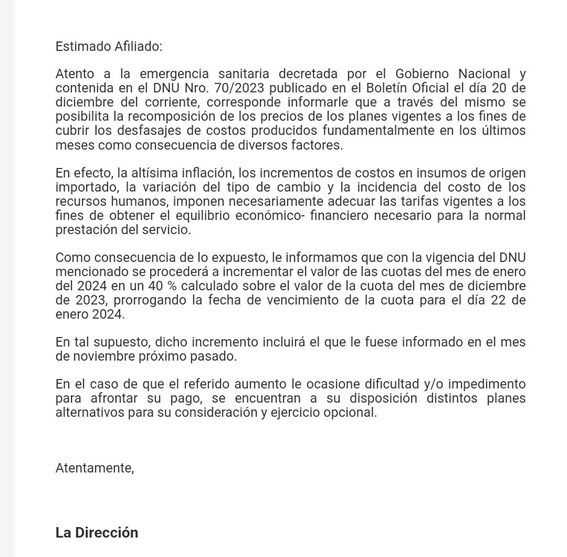 Lo mismo pasó con las empresas prepagas de servicios de salud, que este viernes anunciaron aumentos del 40% basadas en el DNU anunciado que aún no se hizo efectivo. Como dicen desde el gobierno, la libertad de cada individuo es si es caro que no compre para comer, que no pague por su salud, que no viaje en colectivo y vaya en bicicleta al trabajo, total la distancia no es problema, si la luz es cara que no use el aire acondicionado, si el agua es cara que no la use, esa es la libertad que pregonan.