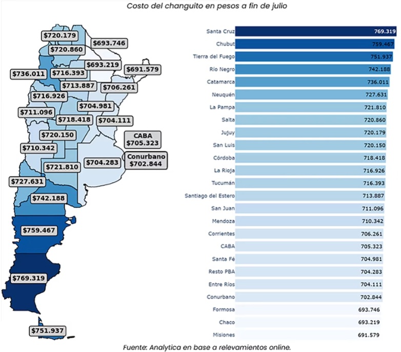 La región patagónica encabeza el ranking de provincias más costosas, con Santa Cruz al tope: llenar el changuito insumió $769.319 durante julio. En la misma zona, Chubut registró $759.467, Tierra del Fuego llegó a $751.937 y Río Negro a $742.188. Estas cifras ilustran el peso de la logística y las condiciones particulares del mercado en el sur donde el costo de vida y salarios es más elevado.